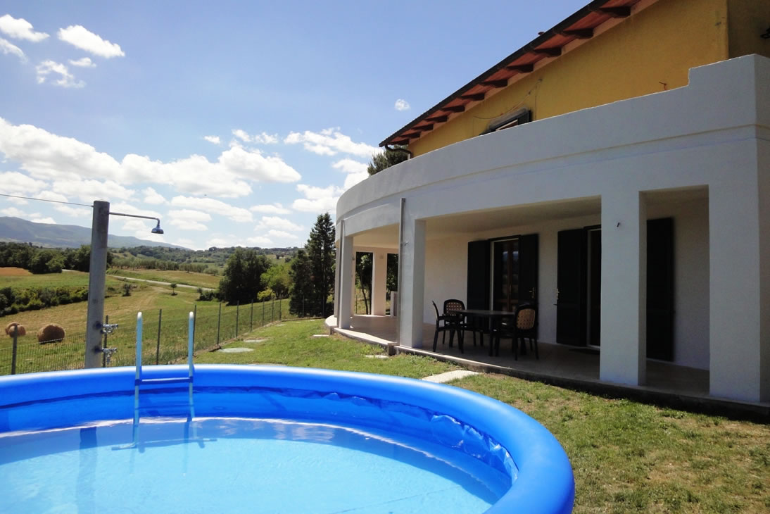 Draußen gibt es Gartenmöbel (1 Tisch, 4 Stühle